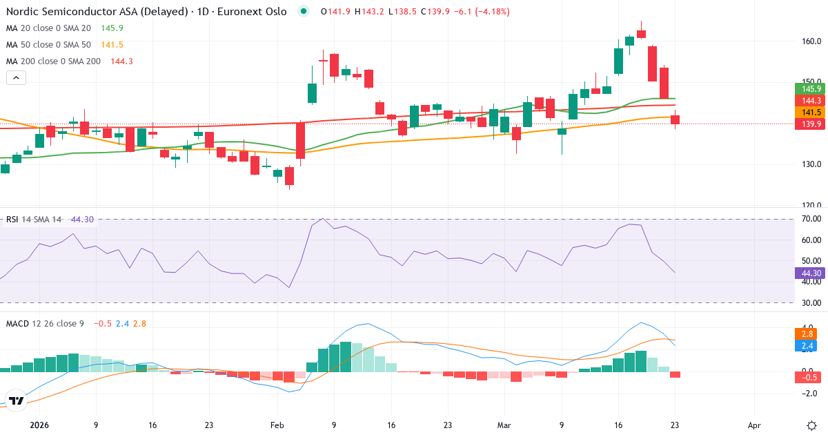 Death Cross: 50-dages gennemsnittet (141.40) ligger under 200-dages (144.30), hvilket er et klassisk bearish signal for Nordic Semiconductor ASA.