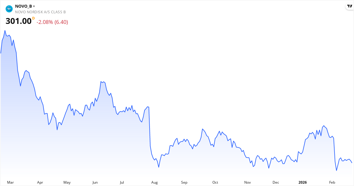 Nyheden: Årsregnskab 2025: omsætning DKK 309,1 mia. (+6% rap., +10% CER) og EBIT DKK 127,7 mia. (-1% rap., +6% CER). Uden ~DKK 8 mia. transformationsomkostninger ville EBIT være +6%/+13% CER. Obesity steg 26% (Wegovy), GLP-1 diabetes +2% rap. 2026 justeret guidance: salg og EBIT -5% til -13% (CER), påvirket af lavere priser/MFN i USA, patentudløb og konkurrence (dato: 2026-02-03 17:38)