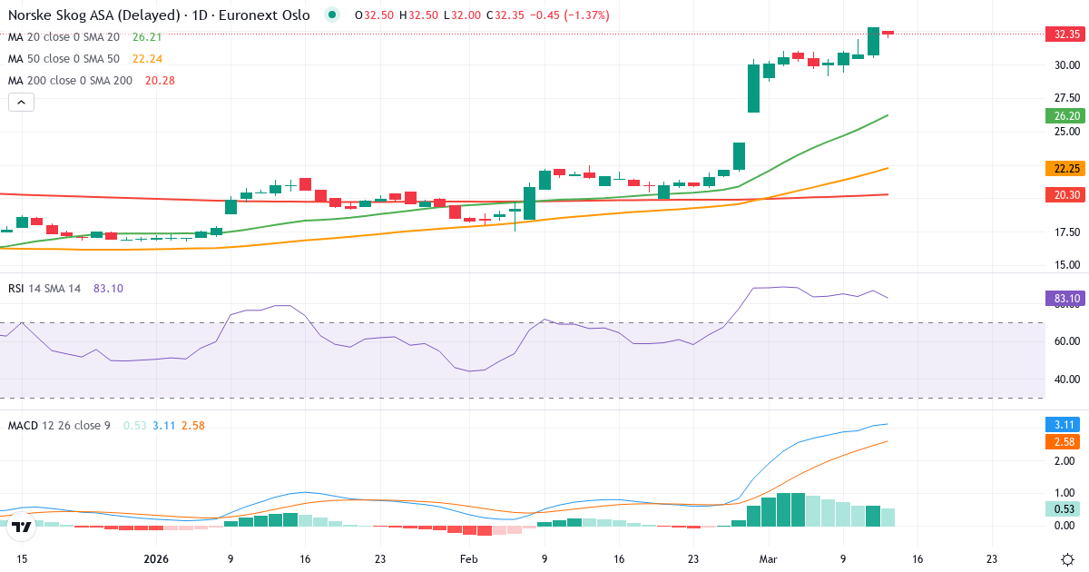 Norske Skog ASA har en RSI på 87.0, hvilket placerer aktien i overkøbt territorium (over 70). Selvom aktien er overkøbt, er den overordnede trend positiv. En kortvarig korrektion er mulig, men trenden støtter fortsat kursen.