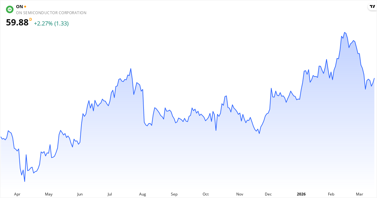 ON Semiconductor aktiekurs – Kursudvikling 2026. Opdateret 18. Mar 2026.
