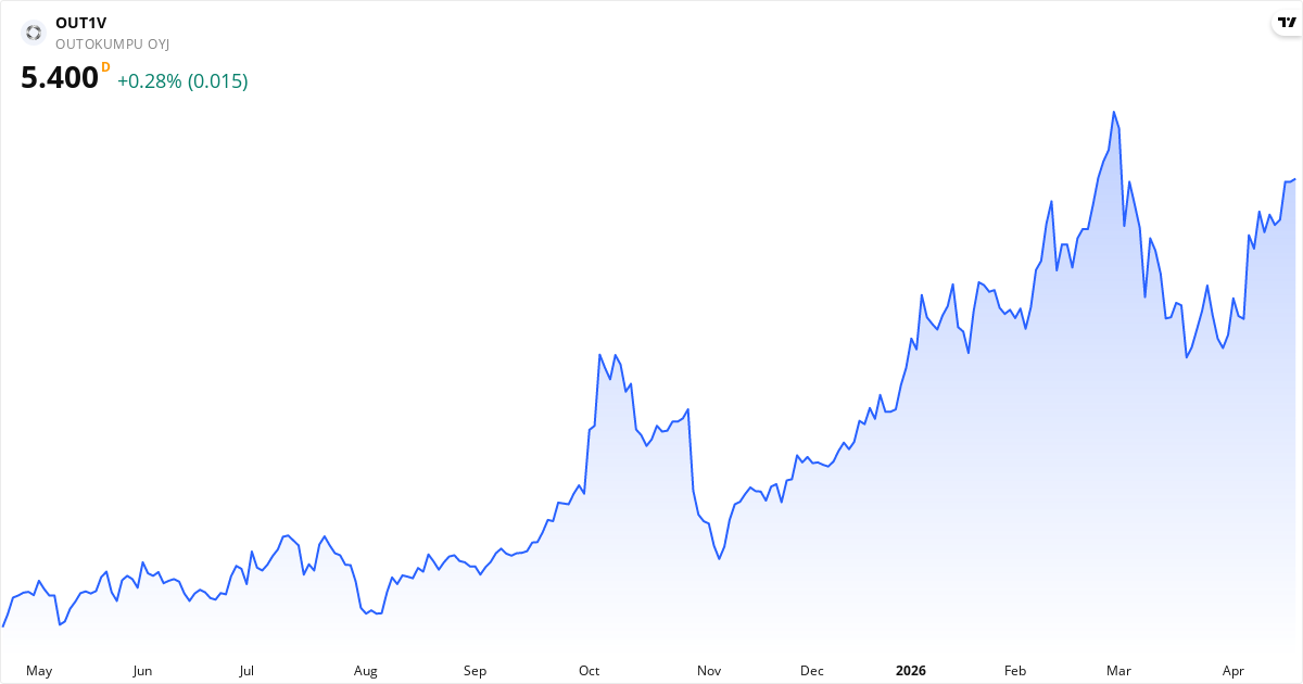 Den aktuelle kurs er €5.375, hvilket placerer Outokumpu i kategorien overvurderet. Aktien vurderes som undervurderet, hvis kursen er under €4.878, og som overvurderet, hvis kursen overstiger €5.962.