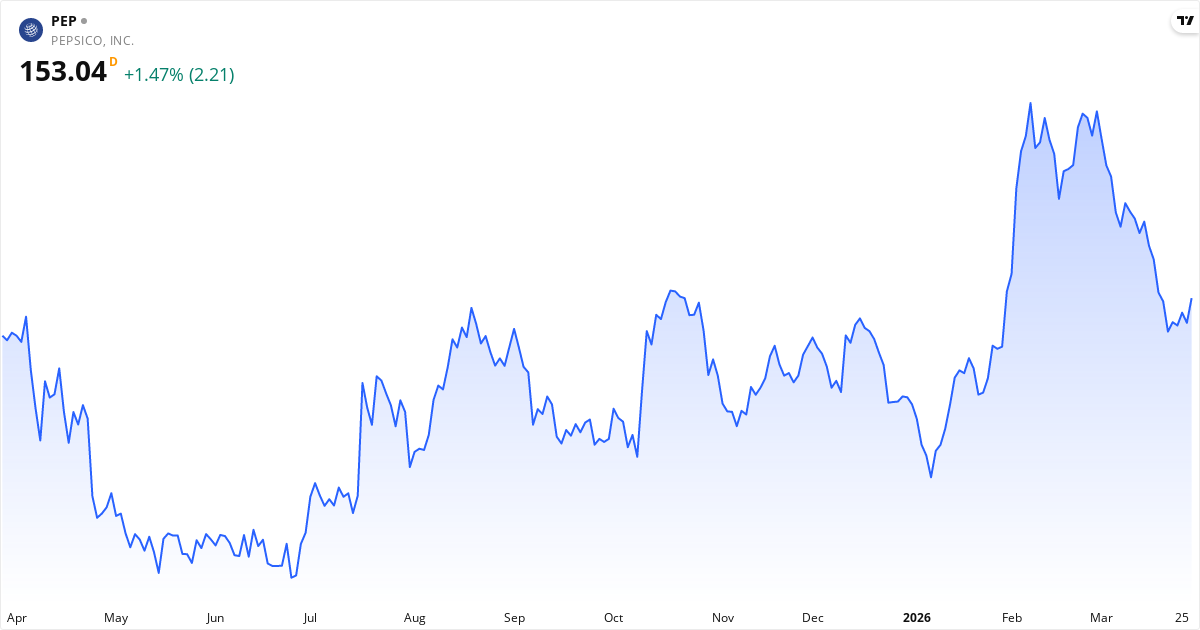 Pepsi offentliggør næste regnskab den 28. april 2026. Aktien handles i øjeblikket til 153.04 $. Med et P/E-tal på 25.1 vil markedet holde øje med om indtjeningen lever op til forventningerne.