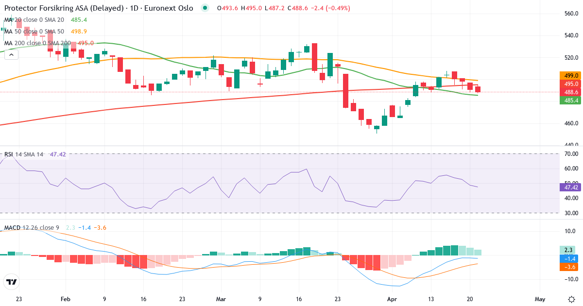 Golden Cross: 50-dages gennemsnittet (499.54) ligger over 200-dages (489.34), hvilket er et klassisk bullish signal for Protector Forsikring ASA.