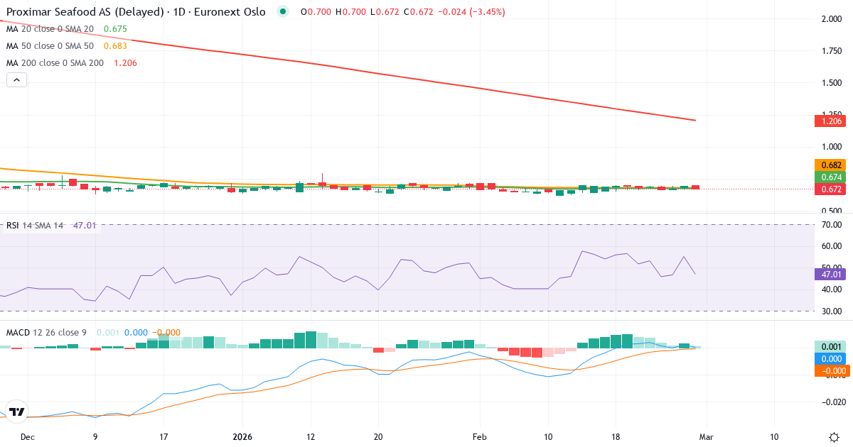Death Cross: 50-dages gennemsnittet (0.68) ligger under 200-dages (1.24), hvilket er et klassisk bearish signal for Proximar Seafood AS.