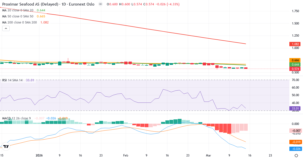 Death Cross: 50-dages gennemsnittet (0.67) ligger under 200-dages (1.11), hvilket er et klassisk bearish signal for Proximar Seafood AS.