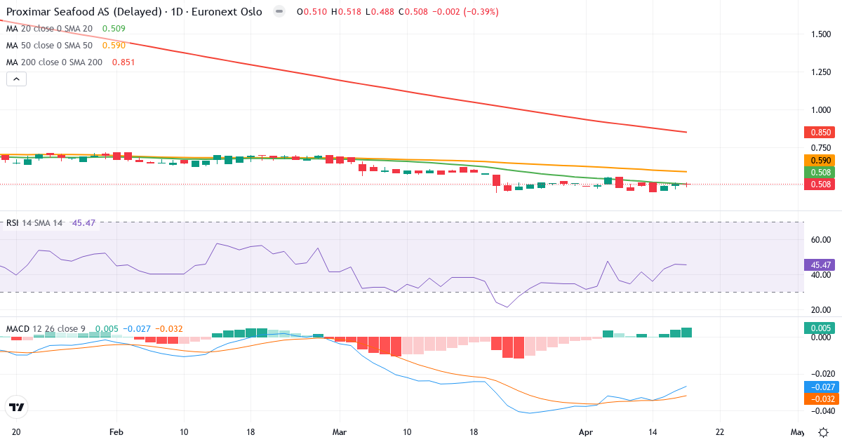 Death Cross: 50-dages gennemsnittet (0.59) ligger under 200-dages (0.87), hvilket er et klassisk bearish signal for Proximar Seafood AS.