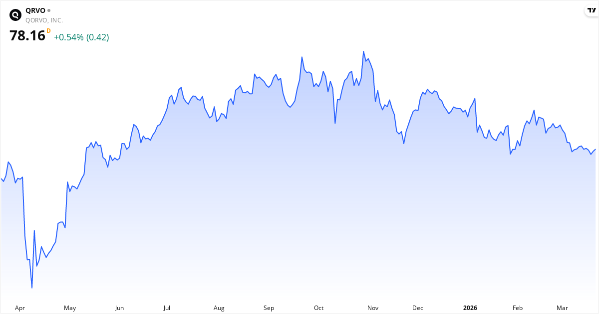 Qorvo offentliggør næste regnskab den 27. april 2026. Aktien handles i øjeblikket til 78.16 $. Med et P/E-tal på 21.5 vil markedet holde øje med om indtjeningen lever op til forventningerne.