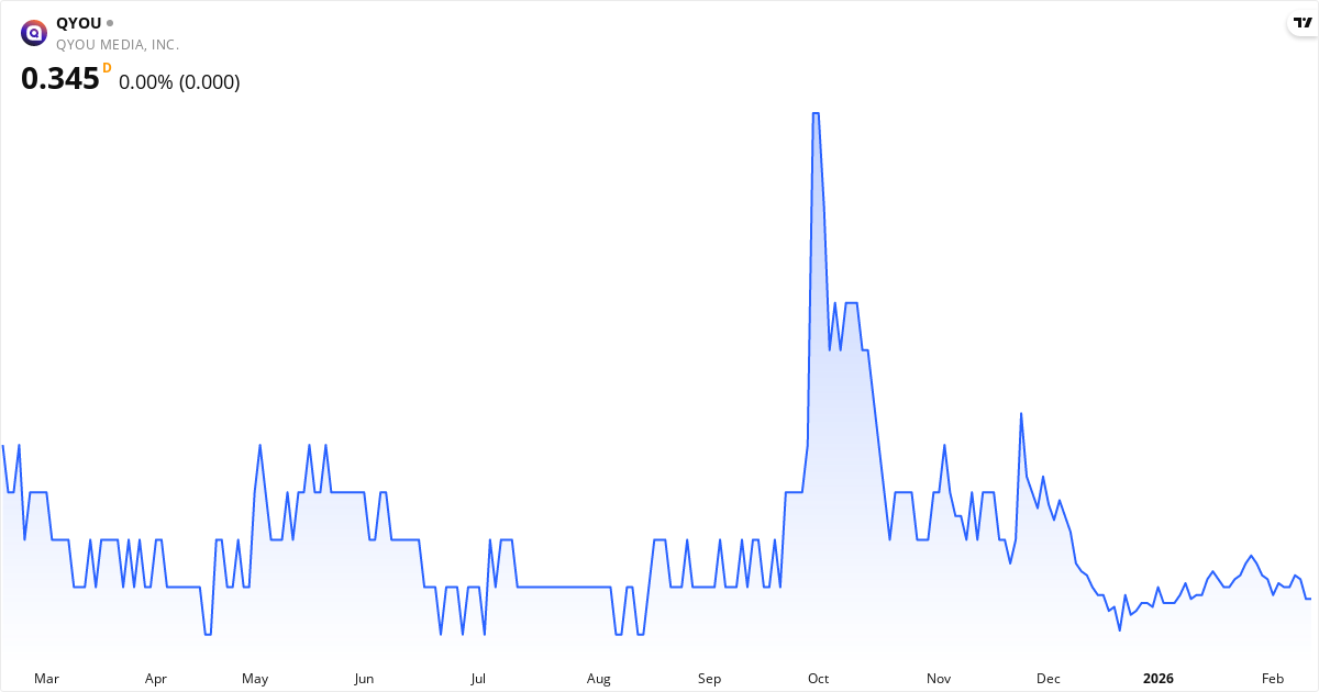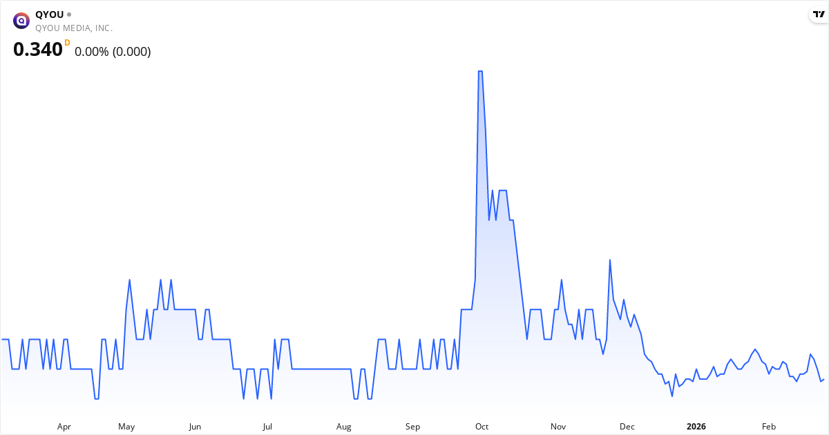 Death Cross: 50-dages gennemsnittet (0.36) ligger under 200-dages (0.42), hvilket er et klassisk bearish signal for QYOU Media Inc.