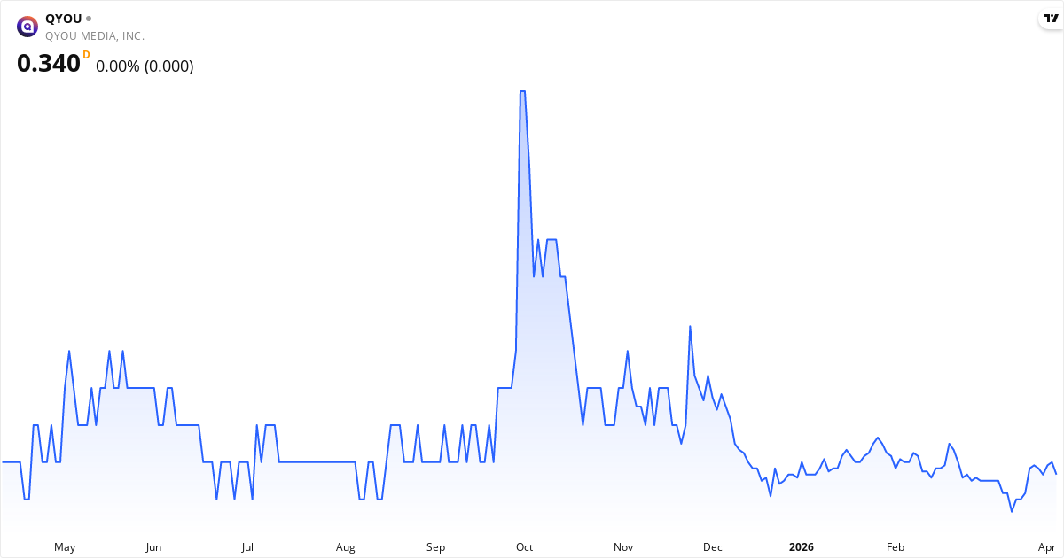 Death Cross: 50-dages gennemsnittet (0.35) ligger under 200-dages (0.40), hvilket er et klassisk bearish signal for QYOU Media Inc.