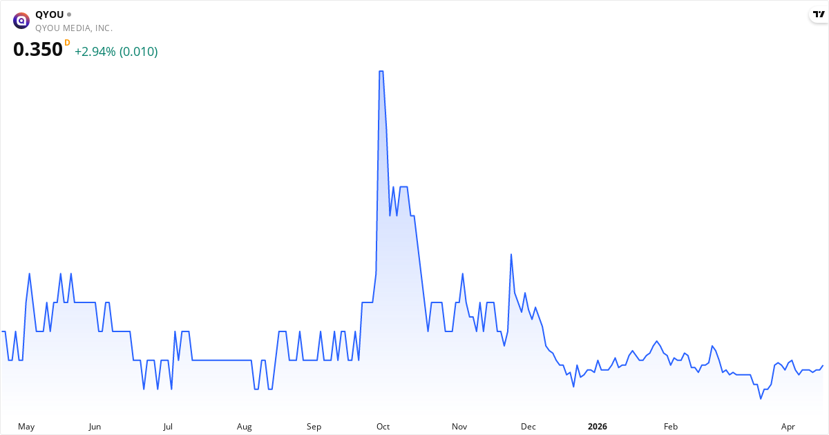 Death Cross: 50-dages gennemsnittet (0.34) ligger under 200-dages (0.40), hvilket er et klassisk bearish signal for QYOU Media Inc.