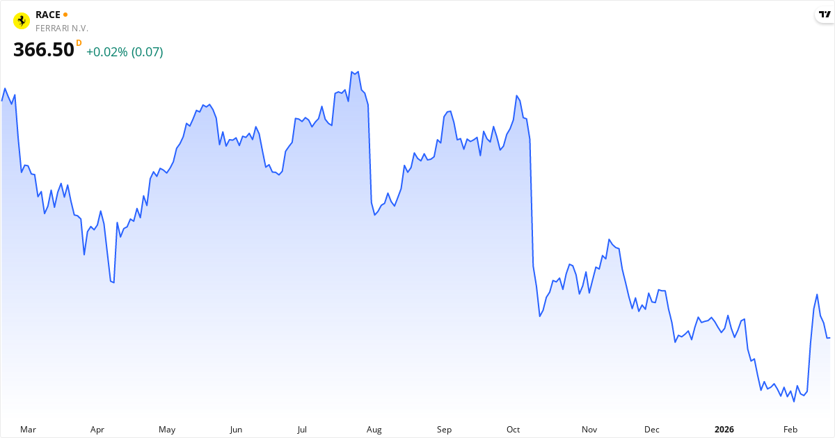 Ferrari N.V er i en kortsigtet optrend. Kursen på 366.50 USD ligger 4.8% over 20-dages gennemsnittet (349.70 USD). På mellemlang sigt er billedet positivt: kursen ligger 1.6% over 50-dages gennemsnittet (360.73 USD). Langsigtet ligger aktien 15.5% under 200-dages gennemsnittet (433.50 USD), hvilket indikerer en langsigtet nedtrend.