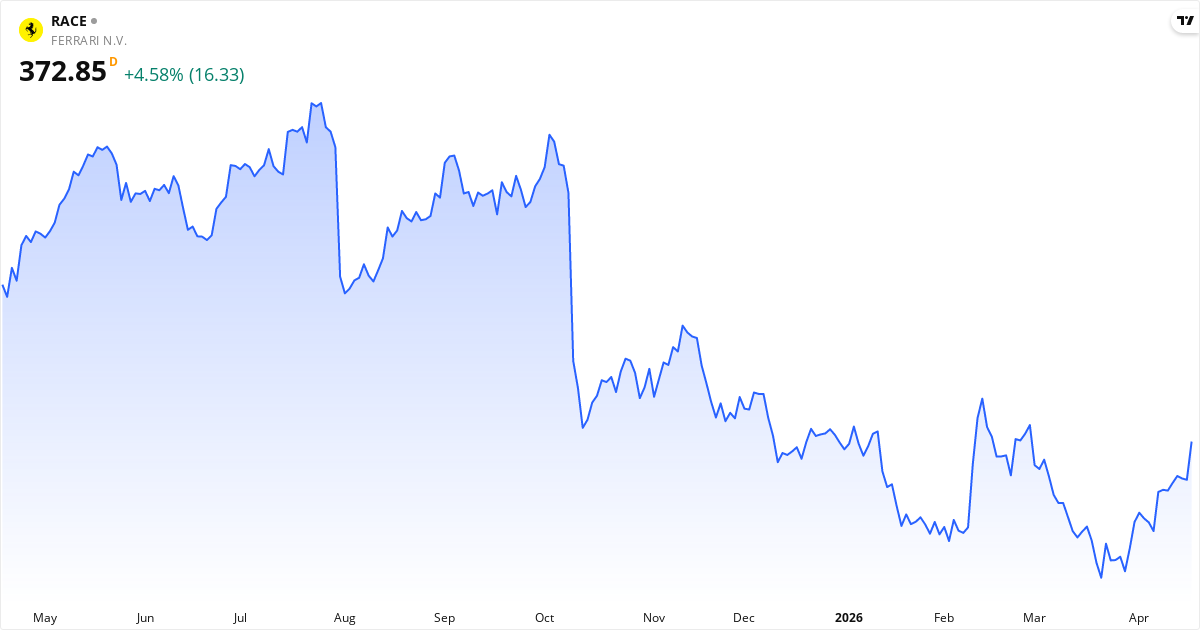 Death Cross: 50-dages gennemsnittet (349.65) ligger under 200-dages (406.69), hvilket er et klassisk bearish signal for Ferrari N.V.