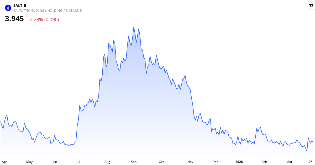 SaltX Technology Holding scorer kun 10 ud af 100 i vores analyse. Aktien er i nedtrend, og mange investorer sidder fast i en position der taber penge. Stop med at gætte – få en gratis porteføljeanalyse og find ud af, om dine aktier trækker din portefølje ned. Vi har hundredvis af aktier der scorer langt højere.