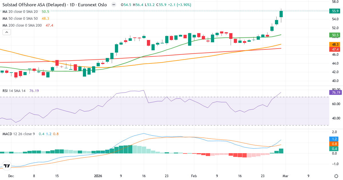 Golden Cross: 50-dages gennemsnittet (48.30) ligger over 200-dages (46.98), hvilket er et klassisk bullish signal for Solstad Offshore ASA.