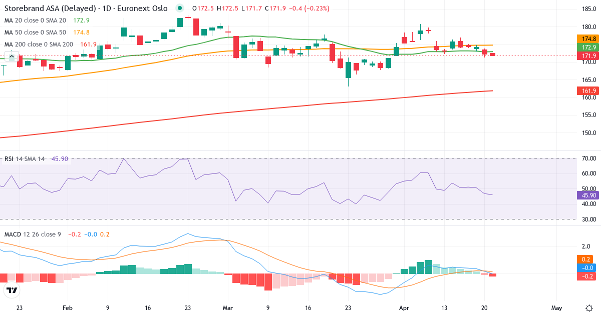 Golden Cross: 50-dages gennemsnittet (170.21) ligger over 200-dages (157.02), hvilket er et klassisk bullish signal for Storebrand ASA.