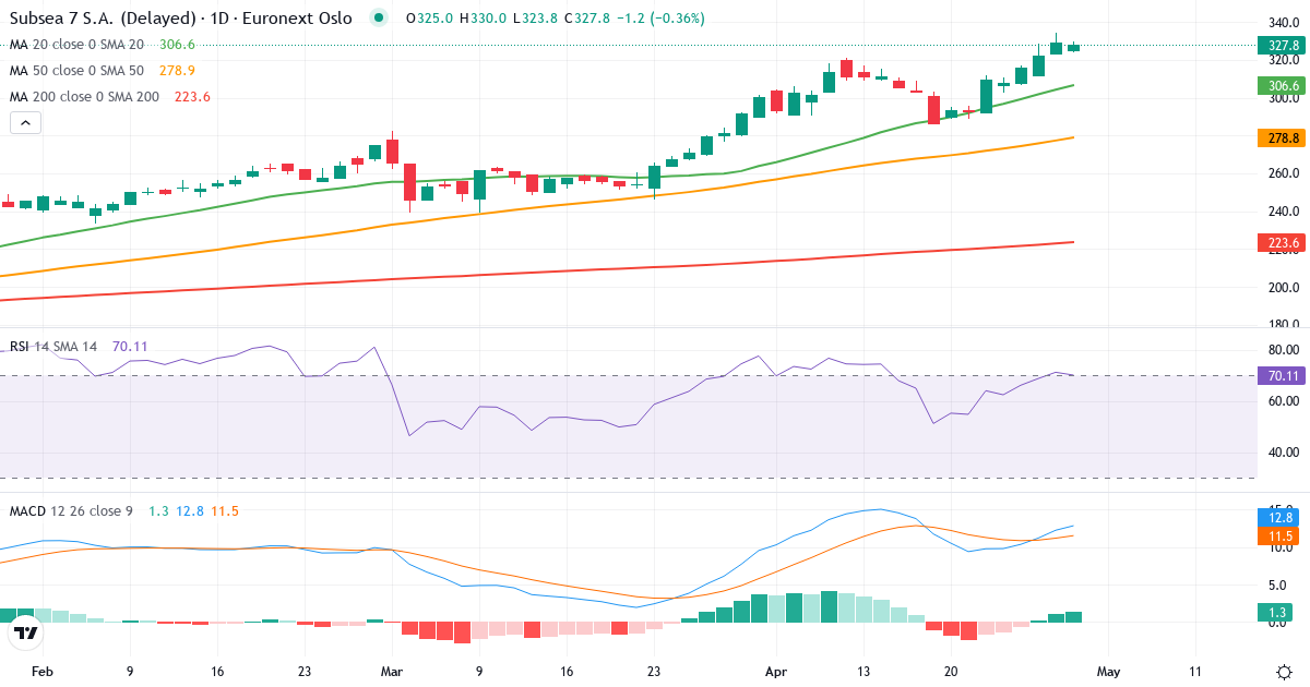 Golden Cross: 50-dages gennemsnittet (277.38) ligger over 200-dages (220.23), hvilket er et klassisk bullish signal for Subsea 7 S.A.