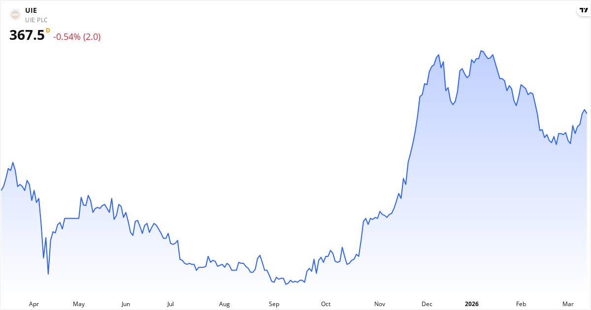 UIE aktiekurs – Kursudvikling 2026. Opdateret 12. Mar 2026.