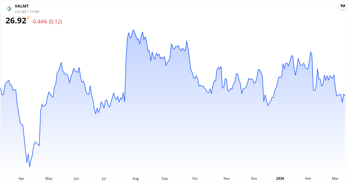Den aktuelle kurs er €27.19, hvilket placerer Valmet i kategorien overvurderet. Aktien vurderes som undervurderet, hvis kursen er under €26.46, og som overvurderet, hvis kursen overstiger €32.34.