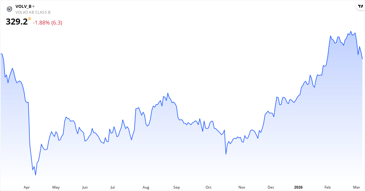 AB Volvo (publ) er i en kortsigtet nedtrend. Kursen på 329.20 Kr. ligger 4.5% under 20-dages gennemsnittet (344.62 Kr.). På mellemlang sigt er billedet positivt: kursen ligger 1.0% over 50-dages gennemsnittet (325.99 Kr.). Langsigtet ligger aktien 14.8% over 200-dages gennemsnittet (286.73 Kr.), hvilket bekræfter en langsigtet optrend.