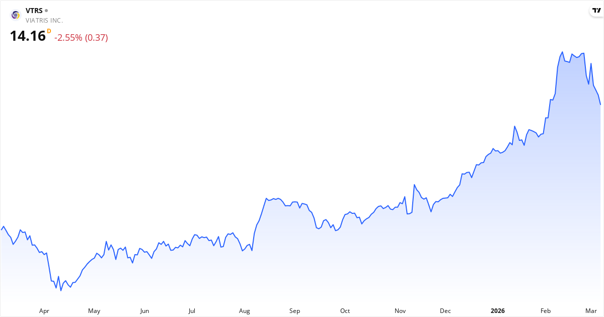 Den aktuelle kurs er $14.16, hvilket placerer Viatris i kategorien overvurderet. Aktien vurderes som undervurderet, hvis kursen er under $13.95, og som overvurderet, hvis kursen overstiger $17.05.