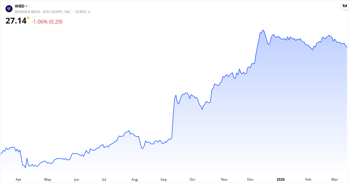 Warner Bros. Discovery aktiekurs – Kursudvikling 2026. Opdateret 16. Mar 2026.